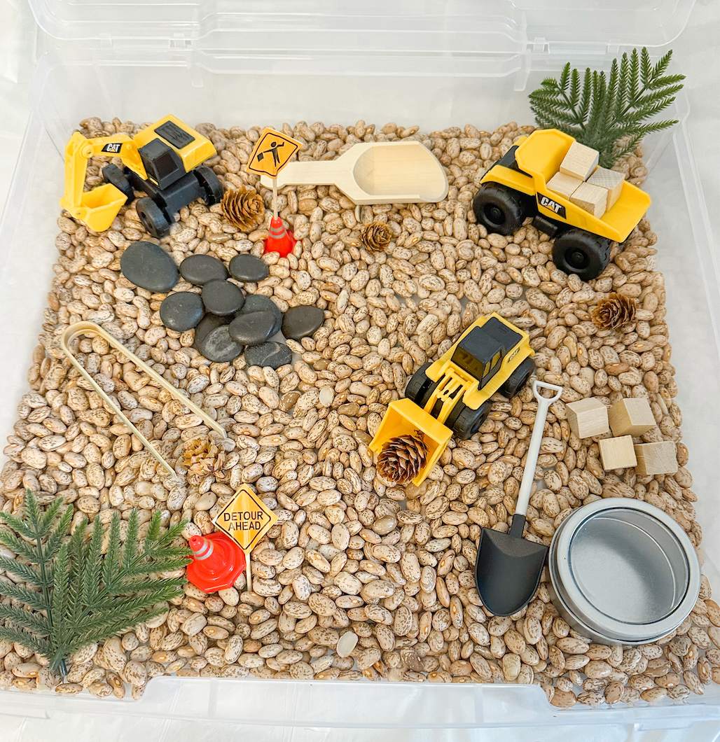 This set is complete with 4 cups of brown beans, 3 construction trucks, and themed manipulatives.