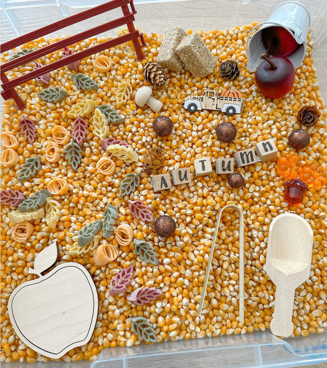 Within the bin there is 3.5 cups of corn kernels, festive pasta, a wooden apple inlet puzzle, as well as other themed manipulatives and tools pictured.
