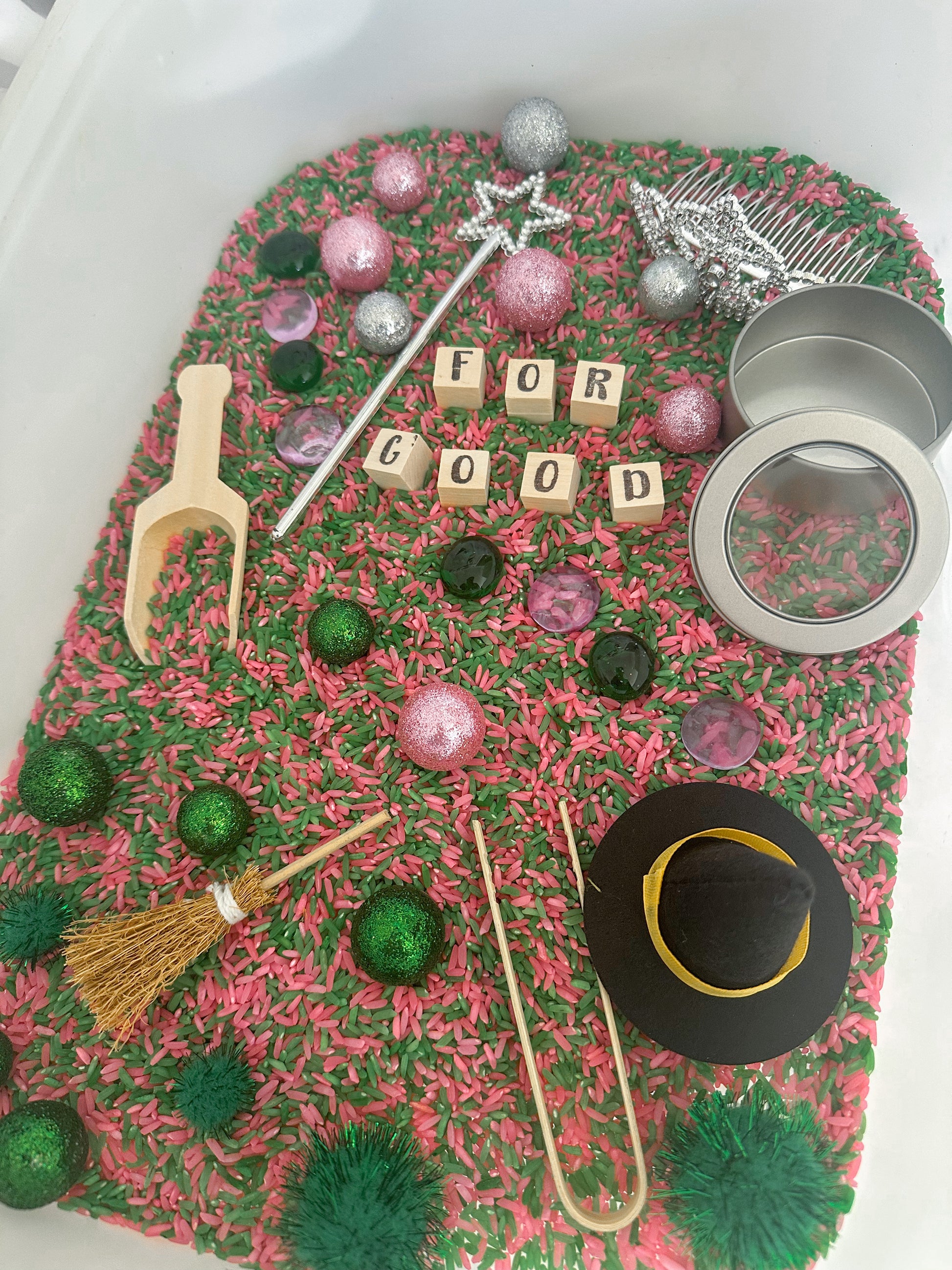 3.5 cups of mixed green & pink rice with themed manipulatives & tools pictures.
