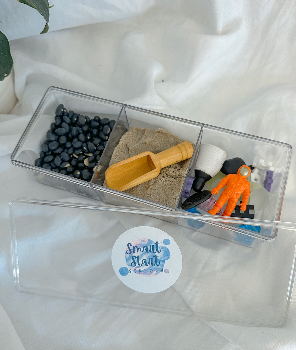 Space fiddle kit comes with kinetic sand, black beans, and space manipulatives & wooden scoop all enclosed in a 3 slot clear container.