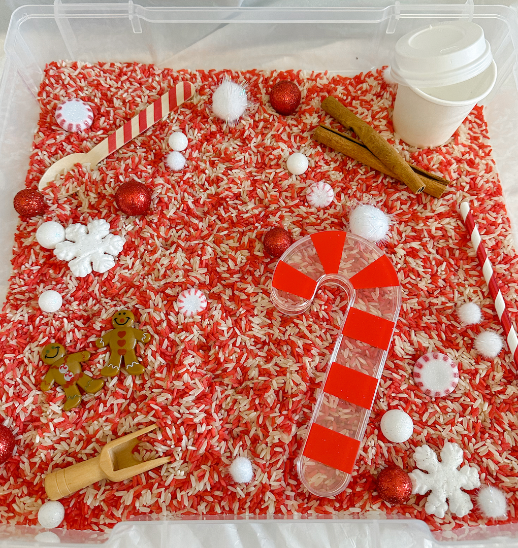 This bin has 3.5 cups of red & white rice, little gingerbread men, and a giant candy cane container. The bin also includes themed manipulatives, cinnamon sticks, and tools pictured.